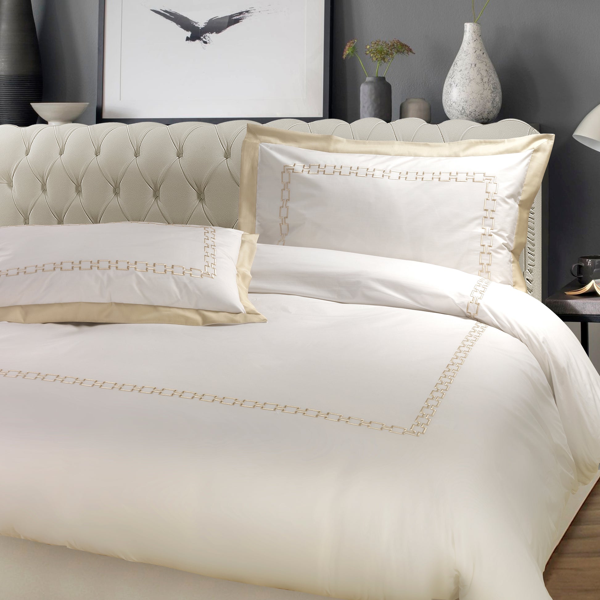 Il tocco morbido e vellutato del percalle di cotone 400TC si combina alla fine eleganza del ricamo, dando vita ad un completo copripiumino sofisticato e di pregio.